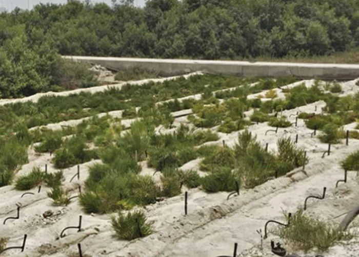The project seeks into utilizing the reject brine a by-product from desalination through modular farming systems to grow fish and the aquaculture effluents enriched in nutrients are used for halophytes (salt-loving plants) irrigation. A pilot integrated farm has been operating at ICBA’s experimental station for the last 4 years implementing this approach (Figure 1). In addition, the potential of using seawater and water from fish farming for halophytes production is also explored in a coastal desert area in Umm Al Quwain (Figure 2). The goal of the project is to bring into production degraded or barren lands with economic benefits for the local communities. The project helps in developing and optimizing the inland and coastal multi-component farms using marginal saline water resources to grow unconventional crops in order to enhance food, nutrition and income security of rural communities that are struggling to produce in hot and dry environments like UAE.